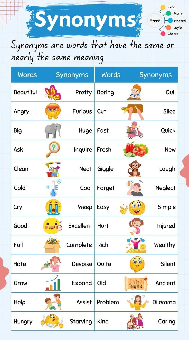 In this lesson, youโll learn how synonyms can help you avoid repeating the same word over and over, and how antonyms can help you clearly show differences. For example, happy and joyful are synonyms, while hot and cold are antonyms. By the end of this lesson, youโll be able to use synonyms and antonyms to better understand what you read and to express your ideas more clearly and creatively. ๐ง โ๏ธ